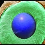 هذه هي العين النامية لجنين سمكة الزرد Zebrafish. صدِّق أو لا تصدِّق، يستخدم العلماء سمكة الزرد لفهم مزيد عن عين الإنسان. فالعينان تتشاركان في بعض السمات الأساسية، مثل الطبقة الشفافة المعروفة بالقرنية Cornea، والعدسة، والمجس الضوئي الخلوي المعروف بشبكية العين Retina. لكن عين سمكة الزرد تتطور بسرعة أكبر بكثير من عيوننا؛ فبعد 12 ساعة فقط من الإخصاب، تكون الأجنة قد طوّرت هذا التركيب البصري المبكر.