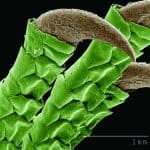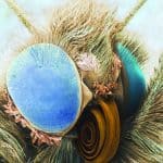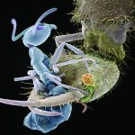 لو كان في إمكان الفراشات التقاط صور سيلفي، لكانت هذه الصورة المقربة هي ما ستراه. تحت المجهر الإلكتروني الماسح، يستطيع العلماء دراسة تشريح الحيوانات بدقة غير مسبوقة. فمثلًا، تكشف هذه الصورة لفراشة ترس السلحفاة Tortoiseshell Butterfly عن الحراشف حول الوجه والشعيرات الدقيقة التي تغطي جسدها. يمكنك أيضًا رؤية أجزاء التغذية الملتفة، أو ما يُعرف بــ «الخرطوم» Proboscis، والذي يُفرَد ليصل إلى النباتات ويرتشف الرحيق.