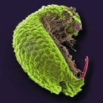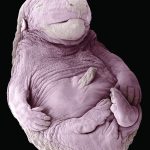 تحمل أنثى القنفذ الأوروبي European hedgehog جنينها مدة 5 أسابيع فقط قبل الولادة. وتلد عادة 4 أو 5 صغار في كل مرة. تُظهر هذه الصورة المأخوذة بالمجهر الإلكتروني الماسح جنينًا في إحدى مراحل الحمل، داخل رحم أمه، قبل أن تتطور أشواكه. يمكن رؤية براعم الأشواك Spine Buds على طول ظهره، حيث تبدأ النتوءات الشوكية في الظهور على صغار القنافذ بعد الولادة بفترة قصيرة.