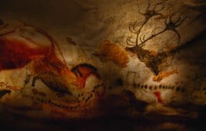 اتخذ الإنسان البدائي من الوجوه الصخرية لوحة له، فاستعمل أصباغًا وأدوات بدائية لتسجيل تاريخه في الكهوف حول العالم. وقد عُثر على بعض أقدم الأمثلة على فن الكهوف في فرنسا وإندونيسيا وإسبانيا. وعلى الرغم من التباعد الجغرافي بينها، فإنها تتشابه في كثير من العناصر. معظم الرسومات تُصوِّر الحيوانات التي كان أسلافنا يصادفونها ويصطادونها، مثل البيسون والخيول والأوروكس Aurochs (وهو نوع من الأبقار المنقرضة) والغزلان، إلى جانب الرموز والبصمات اليدوية. كانت لوحة الألوان محدودة بالموارد المتاحة؛ فقد استخدموا المغرة Ochre ، وهي طين يحتوي على أكسيد الحديد، وطحنوه في أوعية مصنوعة من الأصداف. أما الهيماتيت Haematite، وهو أحد أكاسيد الحديد، فاستُخدم لإنتاج اللون الأحمر الداكن، بينما شكَّل الفحم والعظام المحترقة قاعدة اللون الأسود. ولإنتاج اللون الأبيض استخدموا الحجر الجيري المسحوق أو الكالسيت أو الأصداف، وجميعها أشكال من كربونات الكالسيوم. وبعد تشكيل هذه المعادن على هيئة أقلام شمعية بدائية، كانوا يثبتون الأصباغ على جدران الكهوف باستخدام اللعاب أو عصارة النباتات أو البول.