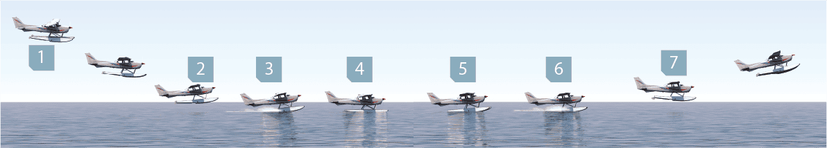 يسحب الطيار عصا التحكم، أو المِقود Yoke، نحو جسمه لخفض الذيل وتقليل سرعة الطائرة عند ملامستها للماء.
