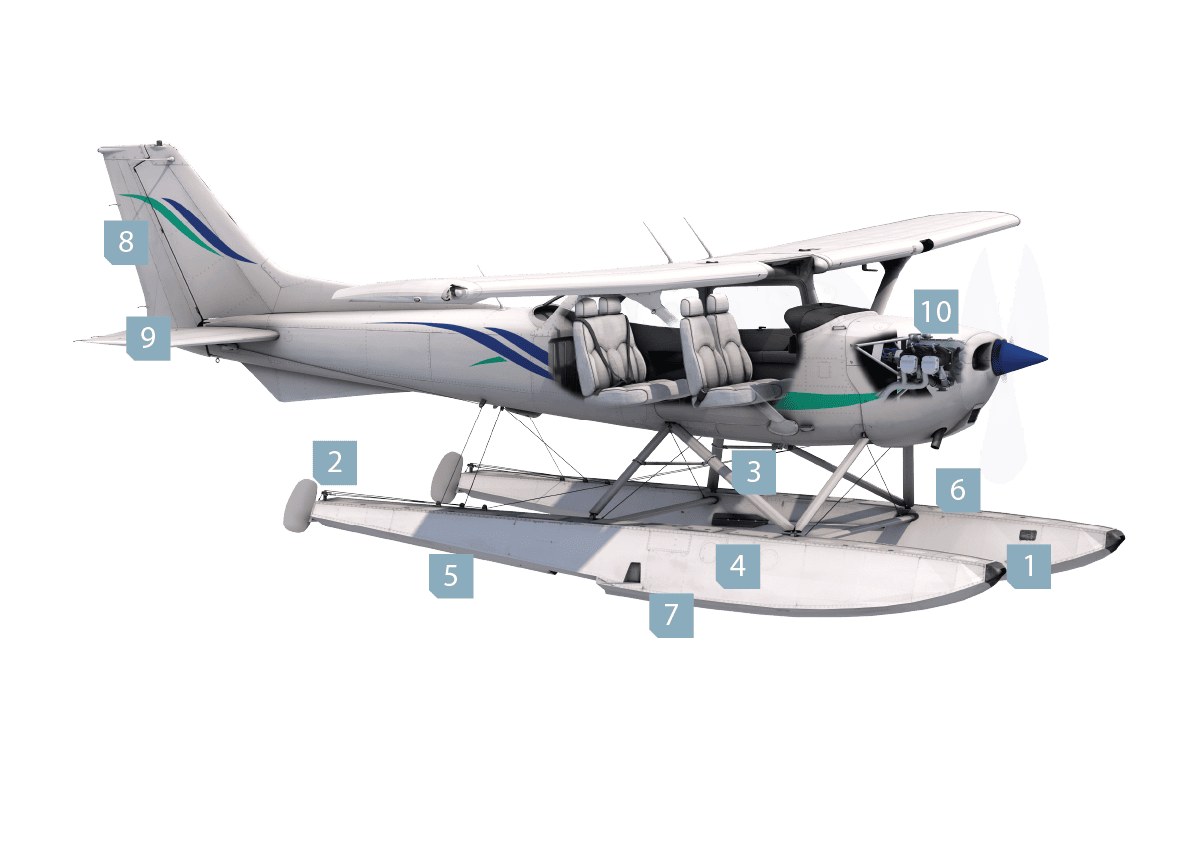 على جانبي جسم الطائرة يوجَد مصدرُ طفوها، أي العوّامات.