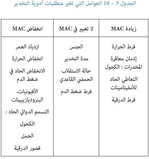 ويوضح (الجدول 3 – 10) العوامل التي تغير متطلبات أدوية التخدير .