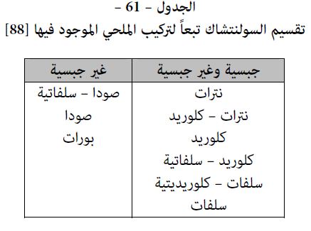 وتبعاً لـــ [88] يمكن تقسيم السولنتشاك أيضاً على أساس المركبات الملحية الموجودة، فيها وذلك حسب الجدول – 61.