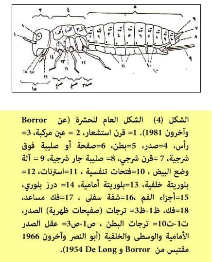 تتميز معظم الحشرات بأنها مستطيلة وأسطوانية في شكلها (الشكل 4)، وجانبي الحشرة الأيمن والأيسر متشابهان في تركيبهما الرئيسي.![]()