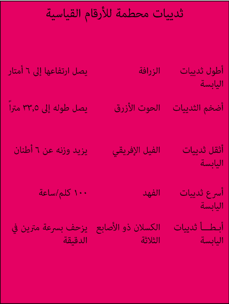 - الفيلة هي أضخم الحيوانات على اليابسة، إذ يمكن أن يصل طولها إلى 4 أمتار ووزنها إلى 10 أطنان، وهي حيوانات ذكية، حيث تمتلك أكبر الأدمغة من بين جميع حيوانات اليابسة، كما تتمتع بذاكرة قوية جداً.