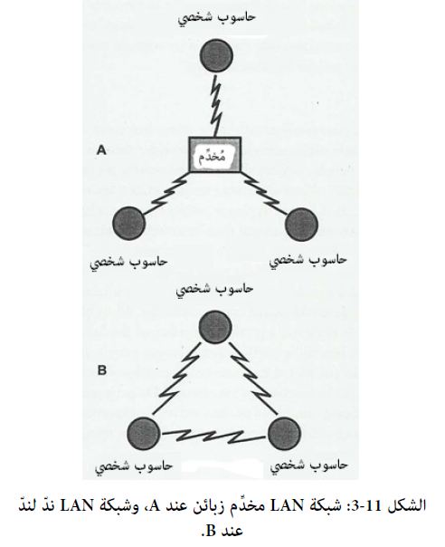 يُقدِّم في شبكةِ مُخدِّمِ الزبائن محليّةِ الامتداد (الشكل 11-3A) حاسوبٌ كبير يُدعى بـ المُخدِّم وصلةً مركزيّةً بين حاسوبَين شخصيَّين اثنَين أو أكثر أكثرَ صغراً.