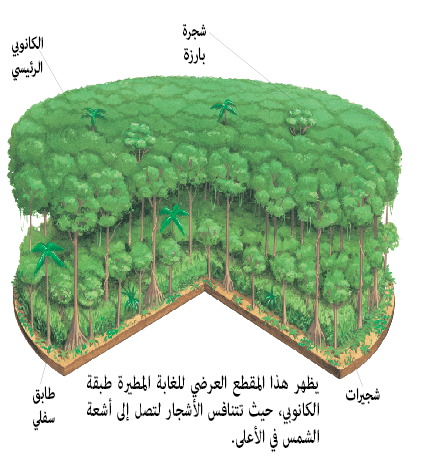 تمتلك الغابة المطيرة مستويات مختلفة، تماما مثل الطوابق في البناية، فالجزء الأكثر كثافة هو الكانوبي، ويبلغ إرتفاعه نحو 30 متراً، حيث تعيش معظم الحيوانات، وتبرز عالياً من الكانوبي أشجار طويلة.