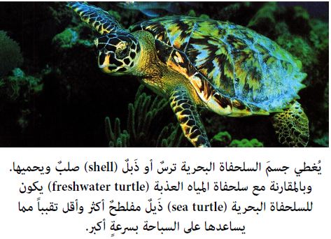 ولا تعيش الأسماك وحسب في البحار، بل هناك أيضاً الزواحف (reptiles)، مثل أفاعي البحر (sea snakes) والسلاحف المائية (turtles)، وهناك الثدييات (mammals) مثل الدلافين (dolphins) والفقمات (seals) .