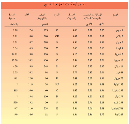 يقع بعد مدار المريخ الحزام الرئيسي للكويكبات أو الكواكب الصغرى. فقط واحد منها (سيريس) يتجاوز قطره 900 كيلومتر (560 ميل)، وأحدها فقط (ڤيستا) يمكن رؤيته بالعين المجردة، فمعظم أعضاء هذا السرب في غاية الصغر فعلاً، وهناك أقل من 20 من كويكبات الحزام الرئيسي يبلغ عرضها 250 كيلومتر (150 ميل).