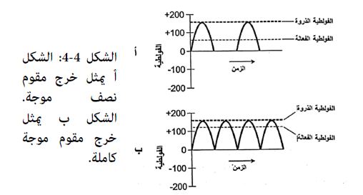 إن أبسطَ أشكالِ دارات التقويم المعروفَ بـ مقوم نصف الموجة (Half-Wave Rectifiers) (الشكل أ 4-3) يستعمل صماماً ثنائياً واحداً (أو مجموعةً من الصمامات الثنائية على التسلسل أو التوازي إذا كان المطلوب تياراً أو فولطية عالية) ليقتطِعَ نصفَ دورة التيار المتناوب.![]()