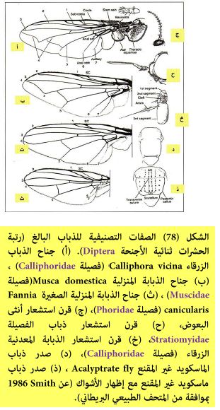 أوضحت في هذا الفصل التركيب الخارجي للذباب البالغ واليرقات التي تم ذكرها في المفاتيح التصنيفية المذكورة أدناه (الأشكال 76 – 79)، ولكن الأعمال الكثيرة الخاصة بالتركيب الخارجي لحشرات رتبة ثنائية الأجنحة تخص المصنفين: Oldroyd (1970a, b)، Colless و McAlpine (1970)، McAlpine وآخرون (1981).![]()