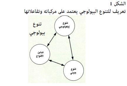 وفي ضوء الاعتبارات الواردة سابقاً، يمكن صياغة أبسط تعريف عملي للتنوع البيولوجي كما يلي: هو مجموعة التنوعات في الجينات والأنواع والموائل والتفاعلات فيما بينها بمكان وزمان محددين (انظر الشكل 1).