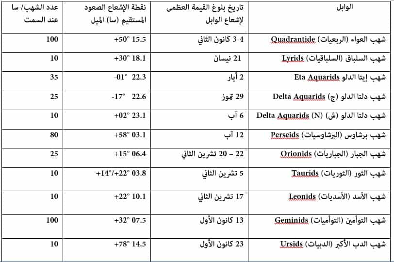 وتبدو الشهب وكأنها قادمة من مصدر إشعاع محدد الموقع في السماء ، ويطلق على الوابل الشهبي اسم الكوكبة التي تبدو الشهب منبعثة منها ، ويبين الجدول التالي أهم الوبال الشهبية وتاريخ حدوثها