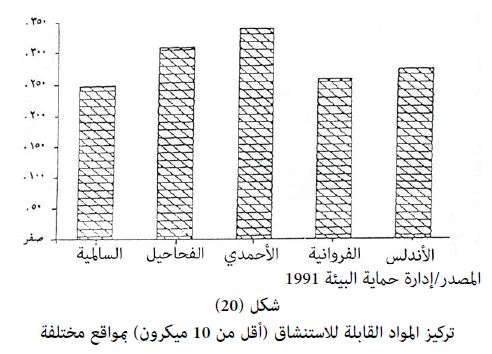 حيث تتركز بصورة عالية في منطقتي الأحمدي والفحاحيل، وهي منطقة قريبة من الآبار المشتعلة في المنطقة الجنوبية. شكل (20).
