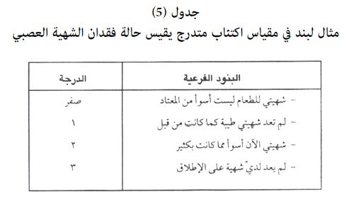 ومن بين هذه الأعراض أيضاً بند متقل بالشهية، يقيسها بشكل متدرج من أول وجودها عادية ثم تناقصها حتى فقدانها تماماً تقريباً. ويبين ذلك جدول (5).