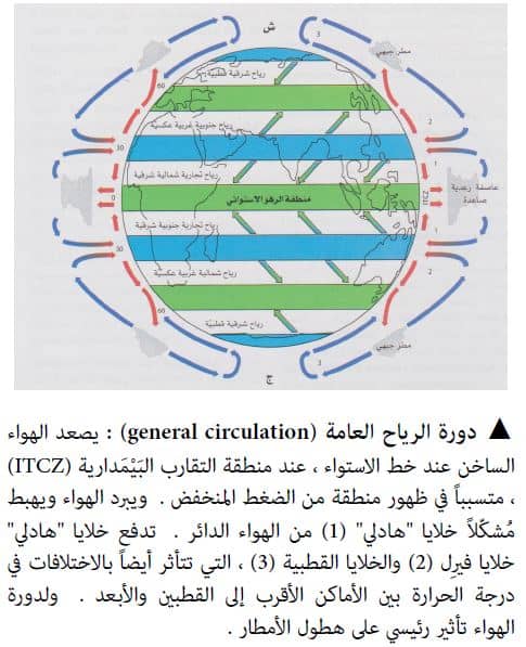 general circulation – دورة الرياح العامة : الحركة العامة للغلاف الجوي (atmosphere) ، وينتج عنها أنظمة معيّنة من الضغط والرياح موسمياً أو على مدار السنة .![]()