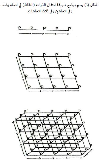 2- إن حركة النقاط ليست قاصرة فقط على انتقالها في خطوط مستقيمة ما يحدث في الأبعاد الثلاثة، وإنما يأخذ في الاعتبار ايضاً أنه أثناء تكوين الشبكة الفراغية قد تتكرر النقطة من خلال دورها دورياً حول محور مركزي (شكل 6).